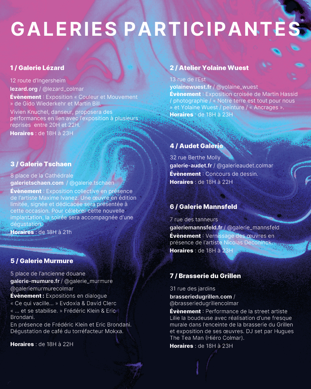 Alors on troque les escarpins du vendredi soir pour une paire de baskets et on part à l’aventure découvrir les différentes activités prévues par toutes les galeries colmariennes participantes.